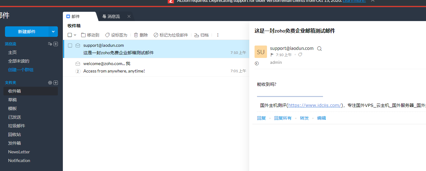 至此,我们完成了所有设置,免费域名企业邮箱已经可以正常使用。看起来步骤较多,但是都比较简单,如果不会的多看一下相关图片。需要注意的是,免费企业邮箱只有5个账户,每用户5GB。且IMAP是做为高级功能,需要付费升级使用,免费企业邮箱只能使用pop3。