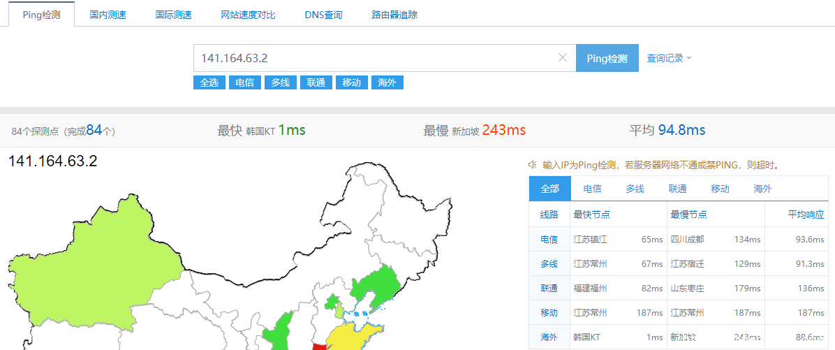 ===测试 [江苏宿迁移动] 到这台服务器的路由===