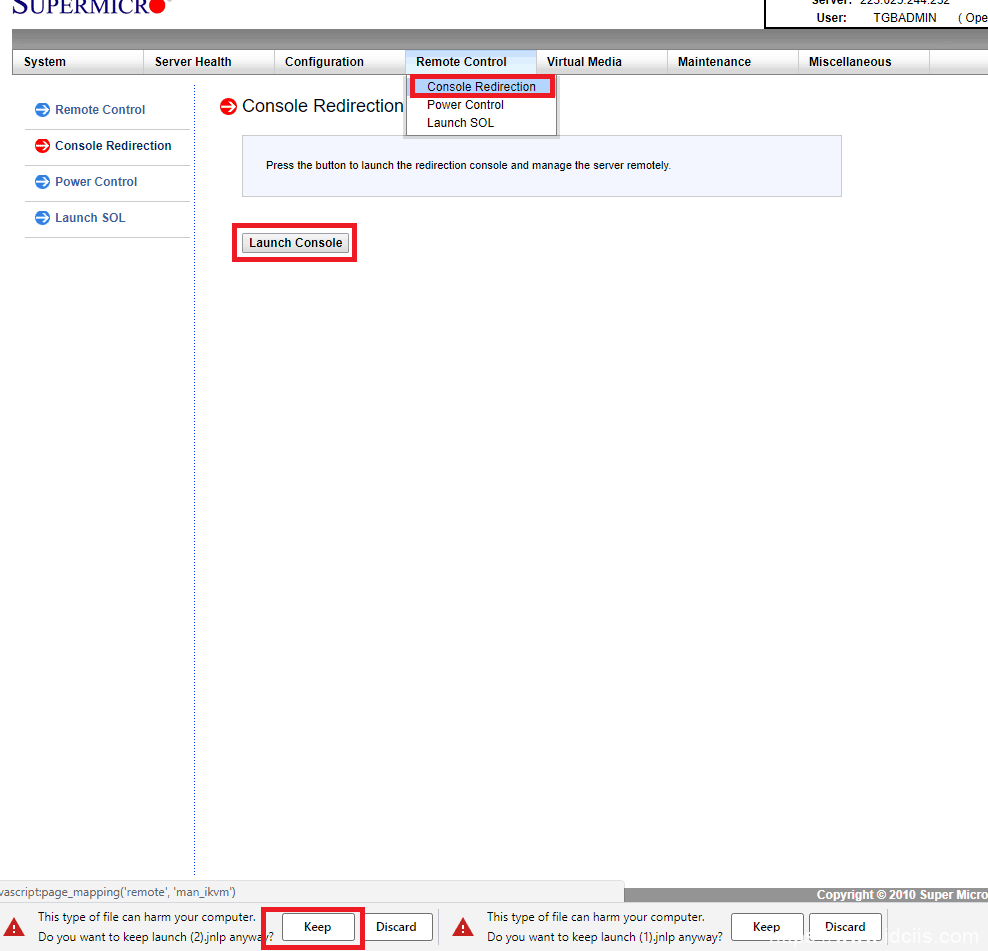 5.单击远程控制 → 控制台重定向 → 启动控制台 →单击保留并下载文件。