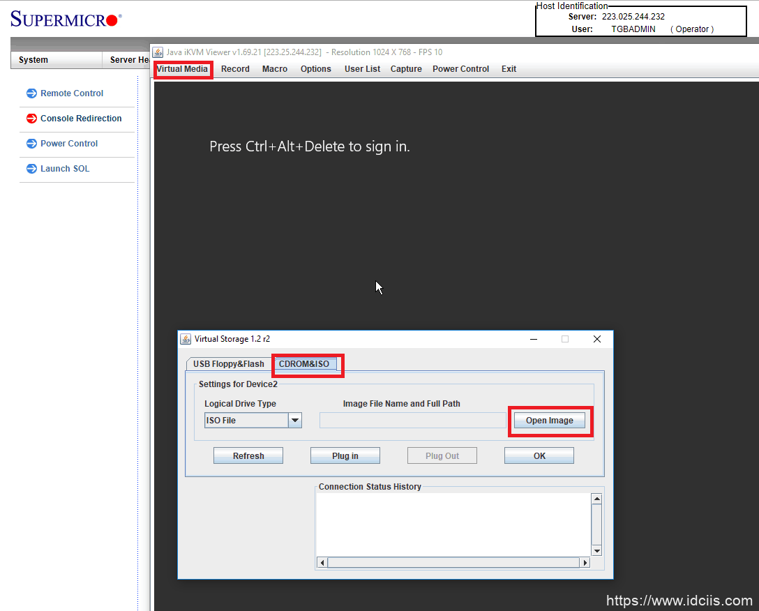 6.将出现一个界面。单击 “ 虚拟介质” →“ 虚拟存储”,将出现一个弹出框,然后单击 “ CDROM &ISO”→“打开图像”。在这里,您可以将安装磁盘映像从本地设备挂载到服务器。