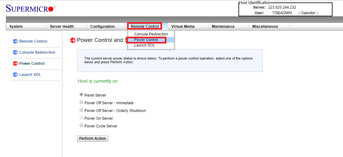 7.转到远程控制 → 电源控制以控制服务器进度。