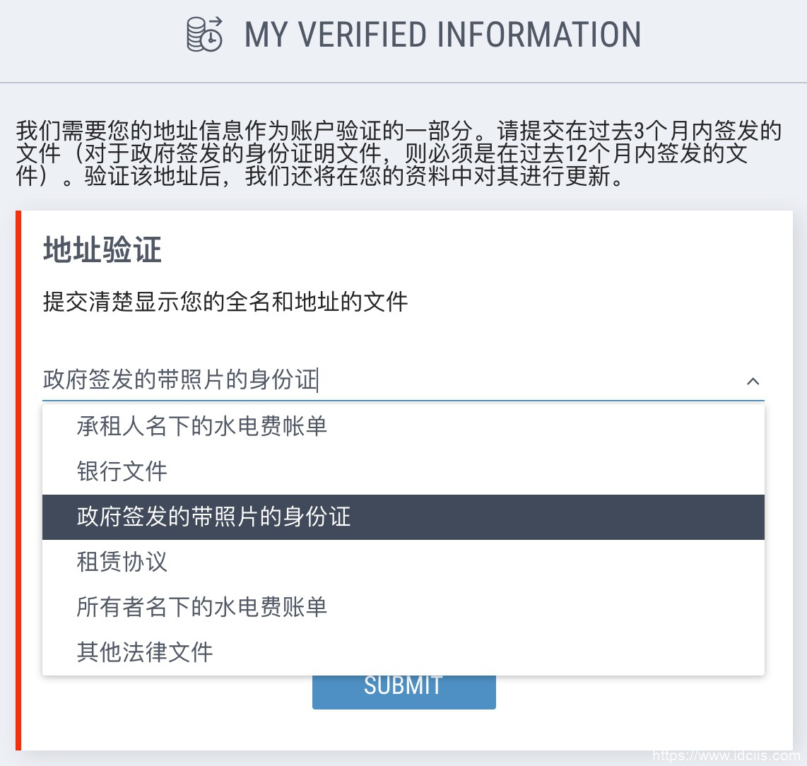 在新的页面中会要求你提交过去3个月内签发的文件,或者过去12个月内政府签发的身份证明文件。地址验证可以提交的文件包括:承租人名下的水电费账单;银行文件;政府签发的带照片的身份证;租赁协议;所有者名下的水电费账单。