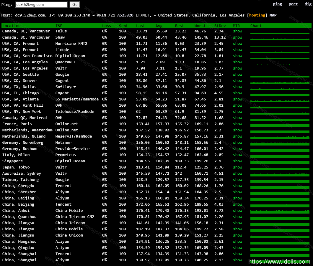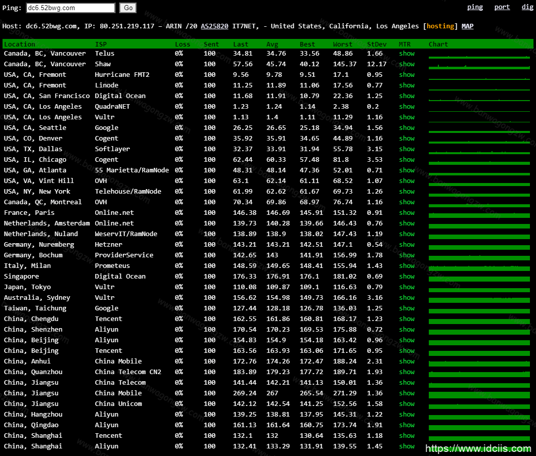 从以上3张图中我们可以看到,DC3 CN2机房在国内某些地区的丢包率还是比较高的,而有些地区的丢包率则为0%。DC9 CN2机房和DC6 CN2 GIA-E机房的表现可是说是傲视群雄,国内和国外节点的丢包率都是0%,可以说是非常稳了。