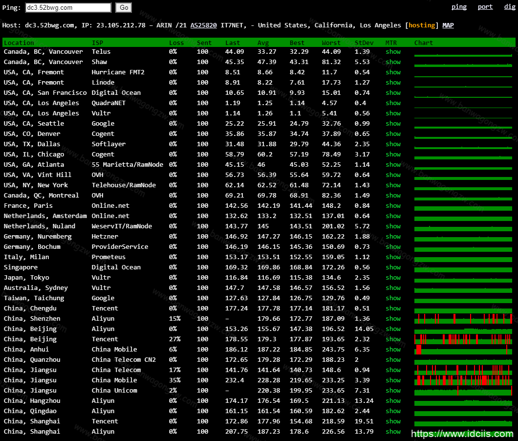 本站依旧是使用搬瓦工官方的ping.pe工具测试的搬瓦工DC3 CN2、DC9 CN2 GIA和DC6 CN2 GIA-E这3个机房在晚高峰时ping延迟和丢包率,测试时间是在北京时间晚8点到晚9点之间。
