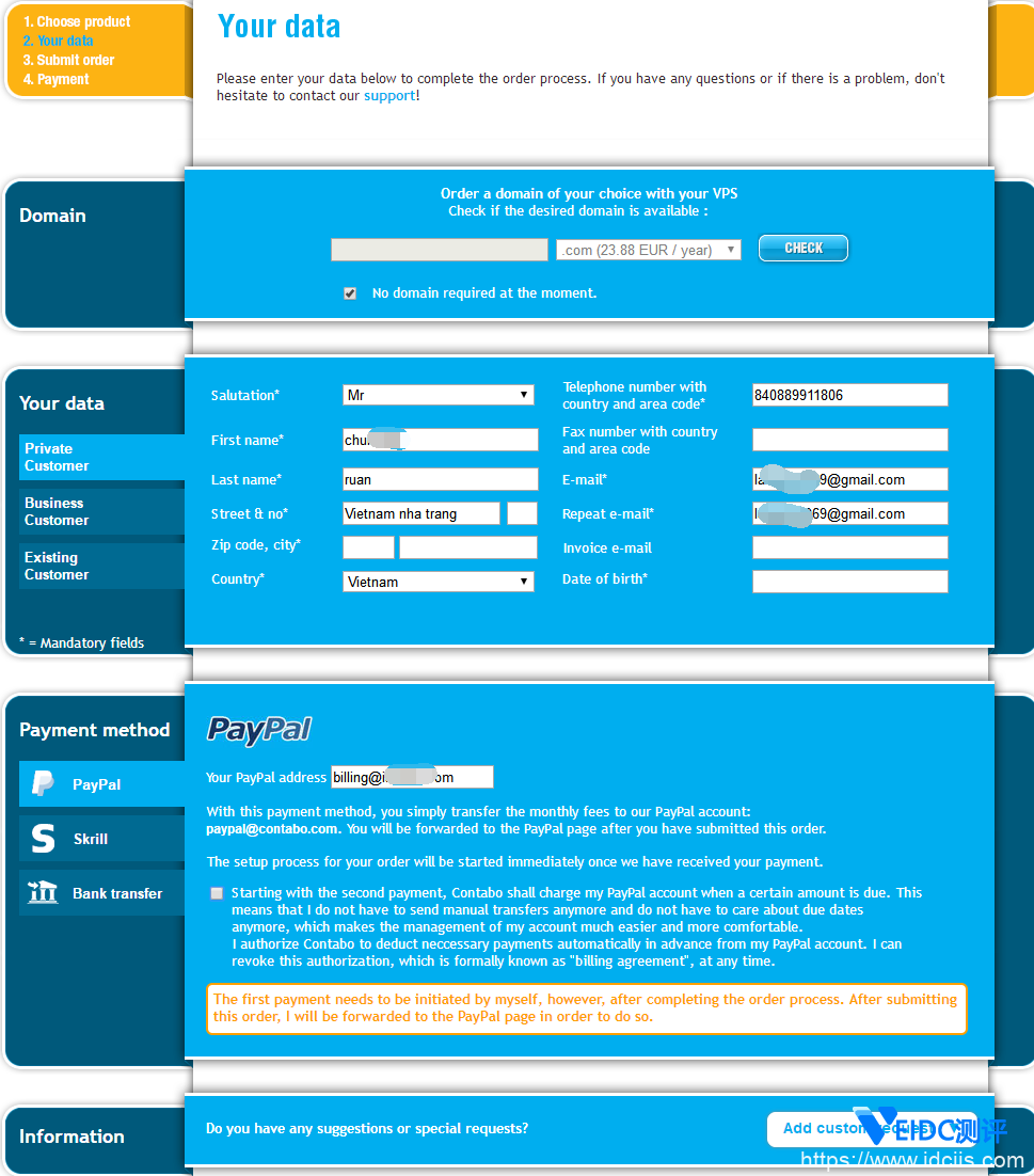 无需注册他们的域名,请勾选:No domain required at the moment,然后填写信息,记住信息一定要真实,本地IP地址和实际地址、邮编、城市、电话要匹配,否则订单十有八九无法通过,要进行资料更新,上图我少填写了几项,提示补充信息后才能进入下一步。