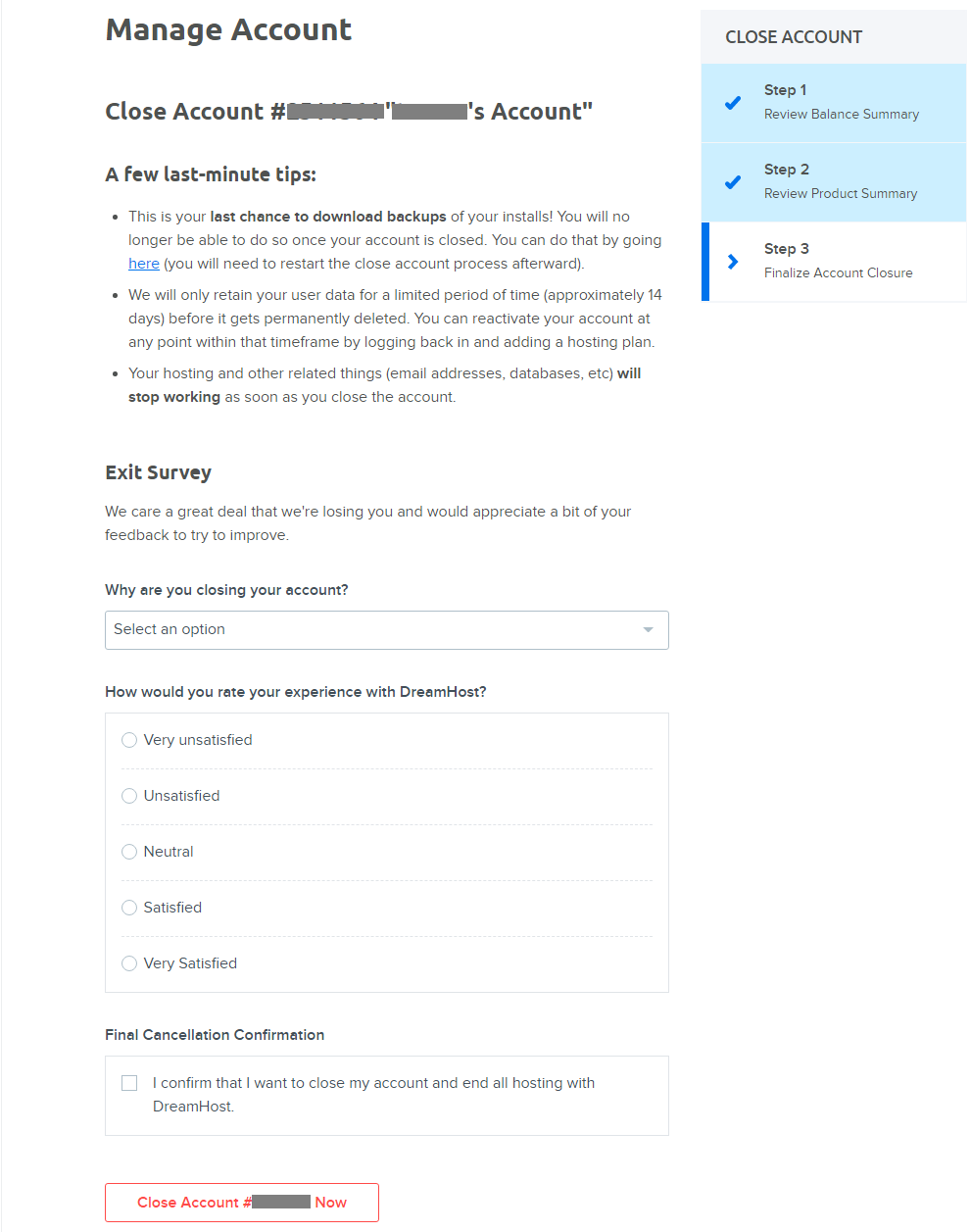 第四步,DreamHost有一个相关调查,可以选择你关闭账号的原因以及对DreamHost产品的满意度,勾选Final Cancellation Confirmation,点击Close Account xxx Now。