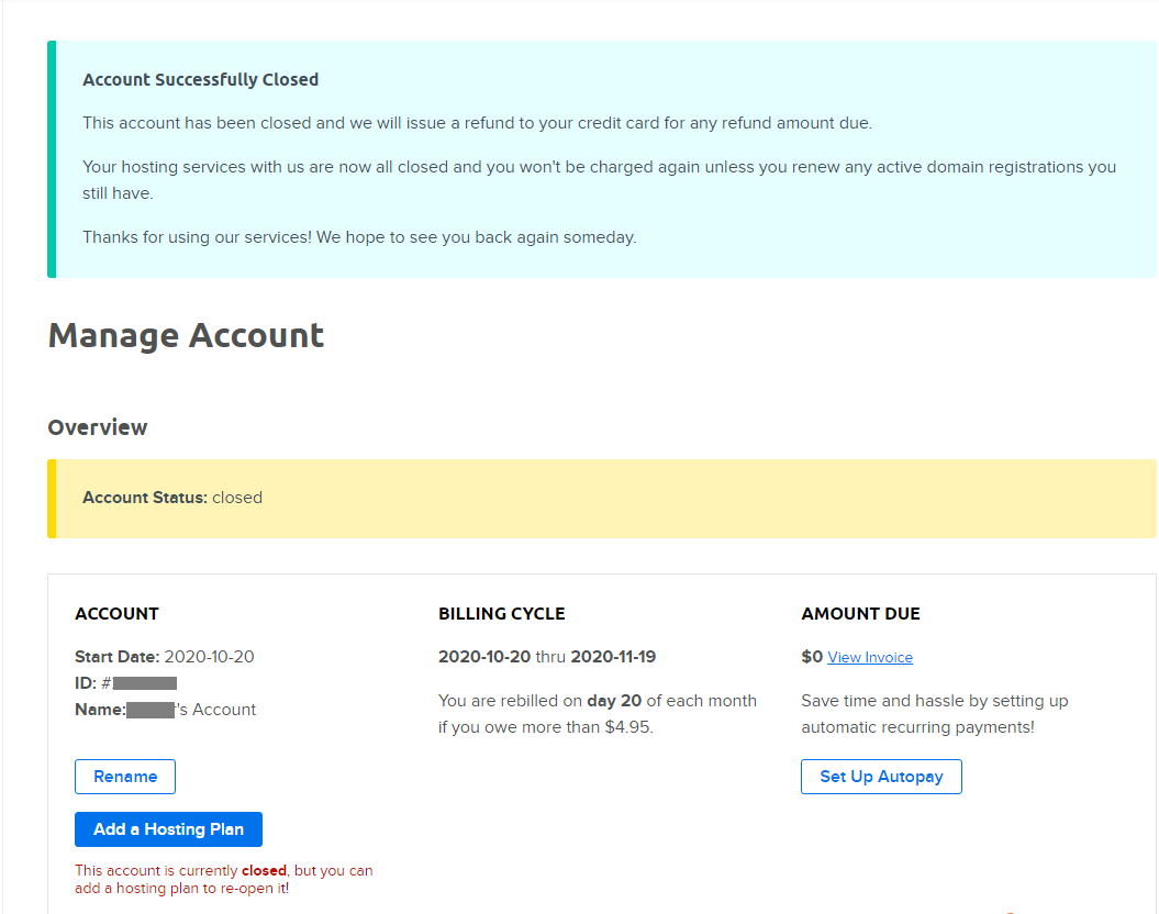第五步,最后,后天回显示账号已关闭,同时DreamHost会把你的付款退回到付款的账号。