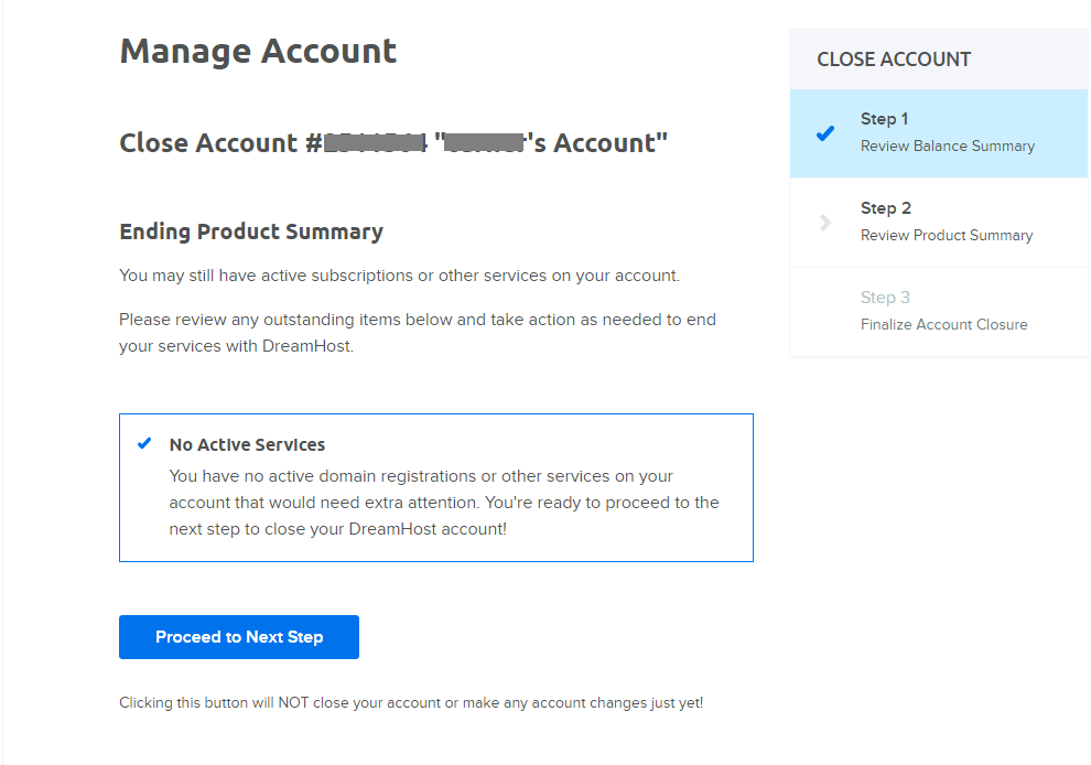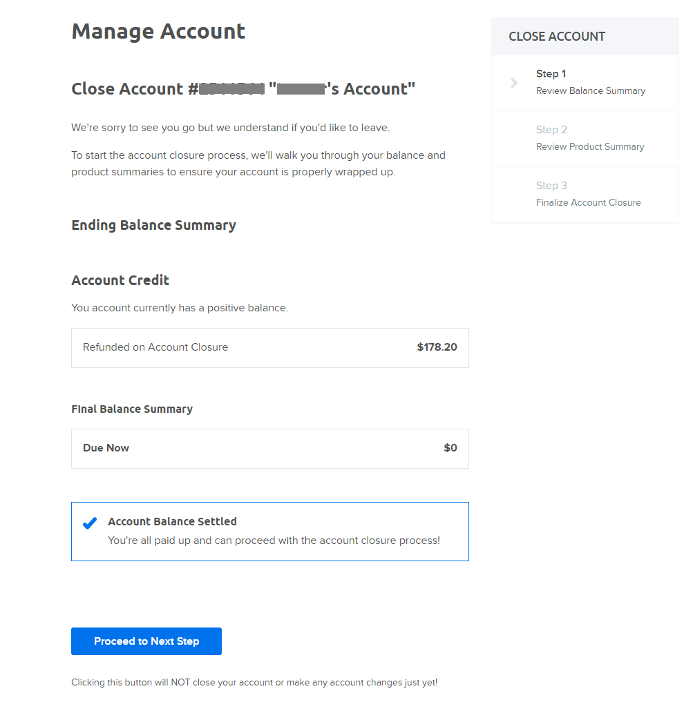 第二步,查看账户详情及图款金额,这里会显示可以获得的退款金额(Final Balance Summary)。在退款保证期内,用户可以获得全额退款,如果注册过域名,会扣除6.99美金的域名注册费用,点击Proceed to Next Step进入下一步。