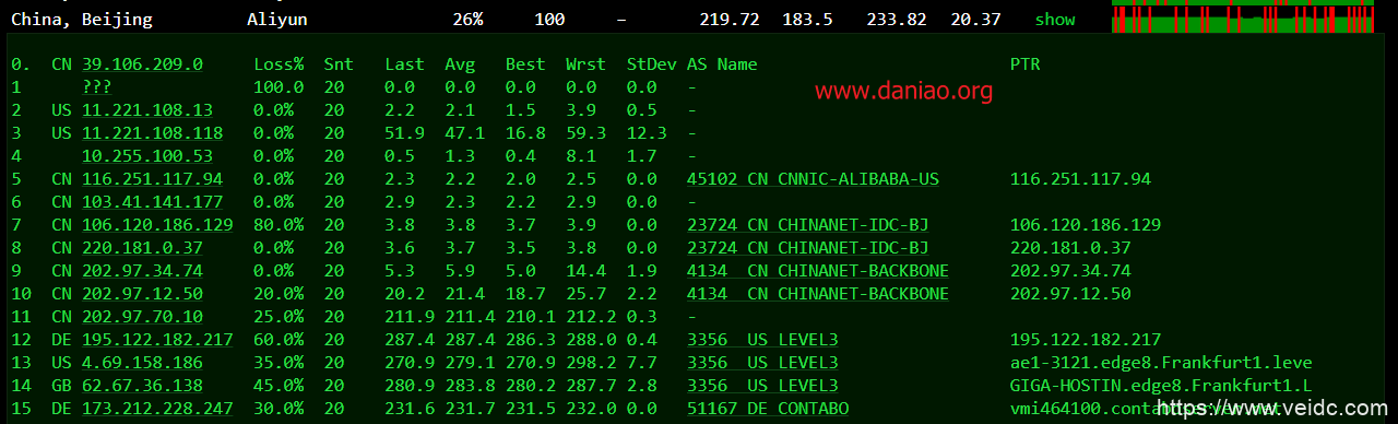 Traceroute to China, Beijing CT (TCP Mode, Max 30 Hop) ============================================================ traceroute to 180.149.128.9 (180.149.128.9), 30 hops max, 60 byte packets 1 213.136.75.1 2.02 ms AS51167 Germany Bavaria Nuremberg contabo.de 2 62.115.36.237 6.99 ms AS1299 TELIA.COM BACKBONE telia.com 3 62.115.113.146 3.91 ms AS1299 TELIA.COM BACKBONE telia.com 4 * 5 118.85.205.81 10.76 ms AS4134 Germany Hesse Frankfurt ChinaTelecom 6 202.97.99.157 163.41 ms AS4134 China Beijing ChinaTelecom 7 202.97.84.213 224.14 ms AS4134 China Beijing ChinaTelecom 8 202.97.58.149 17.84 ms AS4134 Germany Hesse Frankfurt ChinaTelecom 9 180.149.159.6 222.96 ms AS23724 China Beijing ChinaTelecom 10 * 11 * 12 180.149.128.9 226.11 ms AS23724 China Beijing ChinaTelecom Traceroute to China, Shanghai CT (TCP Mode, Max 30 Hop) ============================================================ traceroute to 180.153.28.5 (180.153.28.5), 30 hops max, 60 byte packets 1 213.136.75.1 0.43 ms AS51167 Germany Bavaria Nuremberg contabo.de 2 62.115.155.130 7.11 ms AS1299 Germany Bavaria Nuremberg telia.com 3 62.115.114.148 4.12 ms AS1299 TELIA.COM BACKBONE telia.com 4 62.115.137.165 8.61 ms AS1299 Germany Hesse Frankfurt telia.com 5 62.115.142.194 4.46 ms AS1299 TELIA.COM BACKBONE telia.com 6 62.115.124.116 14.74 ms AS1299 TELIA.COM BACKBONE telia.com 7 202.97.33.133 215.61 ms AS4134 China Shanghai ChinaTelecom 8 202.97.90.181 255.67 ms AS4134 China Shanghai ChinaTelecom 9 61.152.24.17 276.72 ms AS4812 China Shanghai ChinaTelecom 10 * 11 61.152.24.17 271.65 ms AS4812 China Shanghai ChinaTelecom 12 101.227.255.46 235.80 ms AS4812 China Shanghai ChinaTelecom 13 180.153.28.5 254.03 ms AS4812 China Shanghai ChinaTelecom