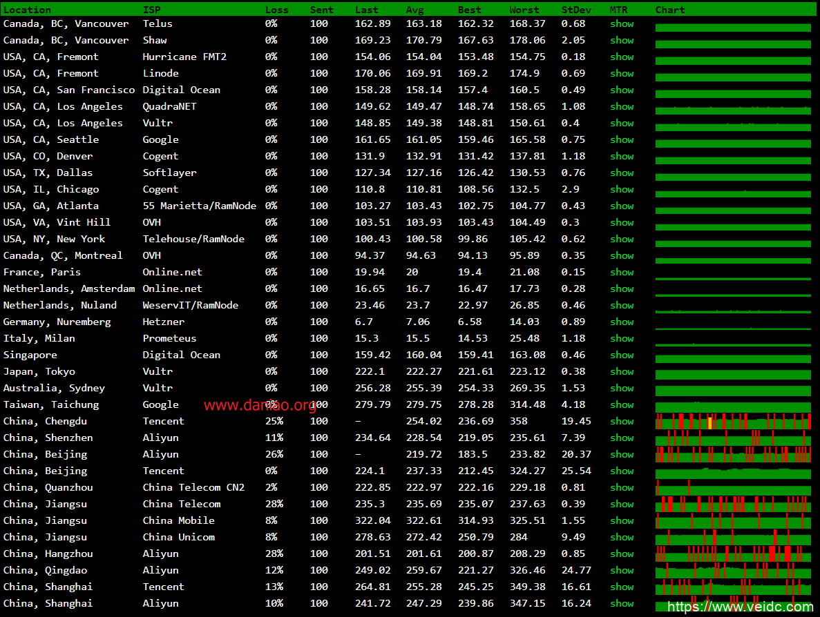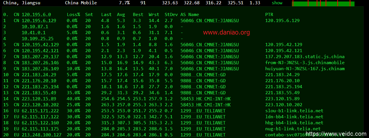 Traceroute to China, Beijing CM (TCP Mode, Max 30 Hop) ============================================================ traceroute to 211.136.25.153 (211.136.25.153), 30 hops max, 60 byte packets 1 213.136.75.1 1.79 ms AS51167 Germany Bavaria Nuremberg contabo.de 2 62.115.172.2 1.36 ms AS1299 Germany Bavaria Nuremberg telia.com 3 62.115.113.174 164.97 ms AS1299 TELIA.COM BACKBONE telia.com 4 62.115.122.161 164.90 ms AS1299 TELIA.COM BACKBONE telia.com 5 * 6 213.155.130.129 165.22 ms AS1299 United States California San Jose telia.com 7 213.248.75.237 162.88 ms AS1299 TELIA.COM BACKBONE telia.com 8 223.120.6.17 150.85 ms AS58453 United States California Los Angeles ChinaMobile 9 * 10 221.176.24.5 285.38 ms AS9808 China Guangdong Guangzhou ChinaMobile 11 221.176.15.209 328.17 ms AS9808 China Beijing ChinaMobile 12 * 13 * 14 * 15 211.136.67.113 308.89 ms AS56048 China Beijing ChinaMobile 16 211.136.95.226 300.04 ms AS56048 China Beijing ChinaMobile 17 * 18 * 19 211.136.25.153 285.09 ms AS56048 China Beijing ChinaMobile Traceroute to China, Guangzhou CM (TCP Mode, Max 30 Hop) ============================================================ traceroute to 120.196.212.25 (120.196.212.25), 30 hops max, 60 byte packets 1 213.136.75.1 0.46 ms AS51167 Germany Bavaria Nuremberg contabo.de 2 62.115.36.237 6.95 ms AS1299 TELIA.COM BACKBONE telia.com 3 62.115.114.146 28.94 ms AS1299 TELIA.COM BACKBONE telia.com 4 * 5 62.115.143.27 28.32 ms AS1299 United Kingdom London telia.com 6 62.115.12.242 30.20 ms AS1299 United Kingdom London telia.com 7 * 8 221.183.55.54 221.24 ms AS9808 China Guangdong Guangzhou ChinaMobile 9 221.183.52.85 228.82 ms AS9808 China Guangdong Guangzhou ChinaMobile 10 221.176.22.161 245.01 ms AS9808 China Guangdong Guangzhou ChinaMobile 11 111.24.5.189 222.30 ms AS9808 China Guangdong Guangzhou ChinaMobile 12 111.24.14.78 224.58 ms AS9808 China Guangdong Shenzhen ChinaMobile 13 211.136.249.17 236.00 ms AS56040 China Guangdong Guangzhou ChinaMobile 14 211.136.196.230 233.68 ms AS56040 China Guangdong Guangzhou ChinaMobile 15 211.136.231.2 237.20 ms AS56040 China Guangdong Guangzhou ChinaMobile 16 120.197.234.133 215.96 ms AS56040 China Guangdong Guangzhou ChinaMobile 17 120.196.212.25 216.81 ms AS56040 China Guangdong Guangzhou ChinaMobile