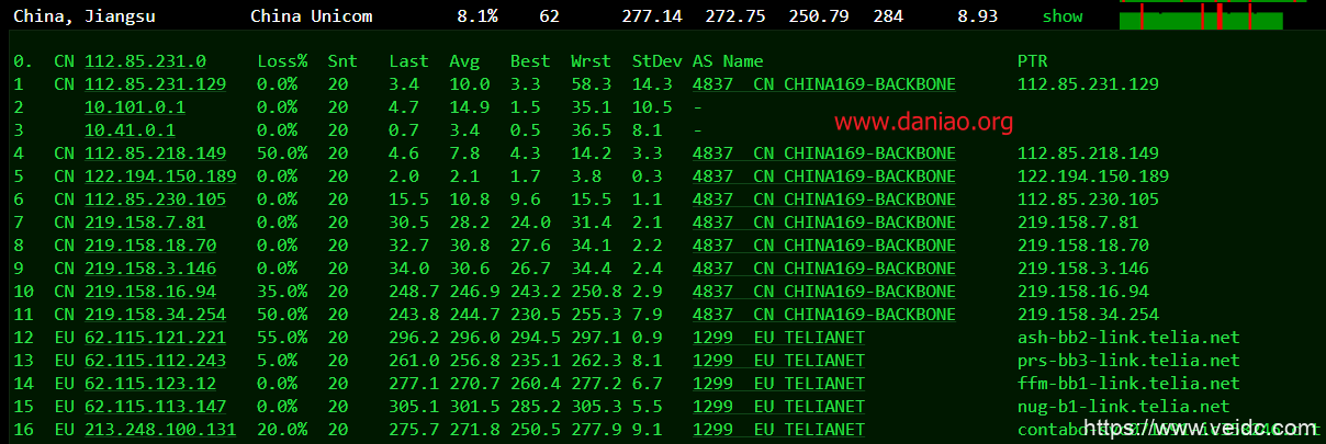Traceroute to China, Beijing CU (TCP Mode, Max 30 Hop) ============================================================ traceroute to 123.125.99.1 (123.125.99.1), 30 hops max, 60 byte packets 1 213.136.75.1 1.61 ms AS51167 Germany Bavaria Nuremberg contabo.de 2 62.115.155.130 6.86 ms AS1299 Germany Bavaria Nuremberg telia.com 3 62.115.114.148 4.27 ms AS1299 TELIA.COM BACKBONE telia.com 4 62.115.142.195 3.92 ms AS1299 TELIA.COM BACKBONE telia.com 5 * 6 62.115.124.116 14.67 ms AS1299 TELIA.COM BACKBONE telia.com 7 219.158.103.29 271.03 ms AS4837 China Guangdong Guangzhou ChinaUnicom 8 * 9 219.158.112.45 293.64 ms AS4837 China Beijing ChinaUnicom 10 202.96.12.62 304.93 ms AS4808 China Beijing ChinaUnicom 11 124.65.63.46 305.89 ms AS4808 China Beijing ChinaUnicom 12 124.65.194.42 289.68 ms AS4808 China Beijing ChinaUnicom 13 * 14 * 15 * 16 * 17 123.125.99.1 292.30 ms AS4808 China Beijing ChinaUnicom Traceroute to China, Shanghai CU (TCP Mode, Max 30 Hop) ============================================================ traceroute to 58.247.8.158 (58.247.8.158), 30 hops max, 60 byte packets 1 213.136.75.1 0.39 ms AS51167 Germany Bavaria Nuremberg contabo.de 2 10.0.50.3 0.81 ms * LAN Address 3 62.67.36.137 17.69 ms AS3356 Germany Hesse Frankfurt level3.com 4 4.69.209.165 156.50 ms AS3356 United States California San Jose level3.com 5 4.53.209.22 407.81 ms AS3356 United States California San Jose level3.com 6 219.158.102.113 403.23 ms AS4837 China Shanghai ChinaUnicom 7 * 8 * 9 * 10 139.226.228.46 422.04 ms AS17621 China Shanghai ChinaUnicom 11 139.226.225.22 414.57 ms AS17621 China Shanghai ChinaUnicom 12 58.247.8.153 440.74 ms AS17621 China Shanghai ChinaUnicom 13 * 14 * 15 * 16 * 17 * 18 *