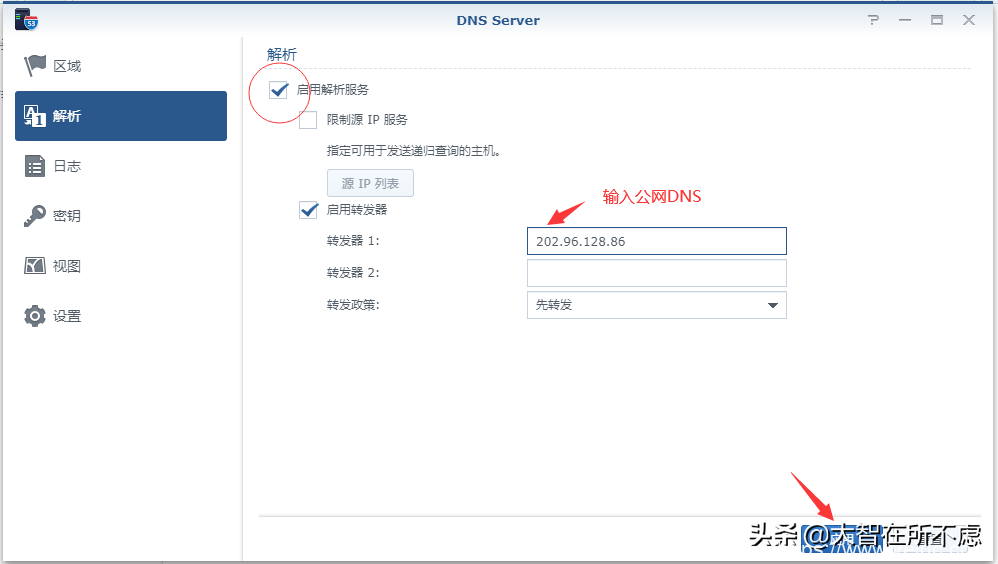 内网DNS指向本地NAS的DNS,这里要填公网的DNS,你访问公网才会帮你转发。不启用转发是不能访问公网的。