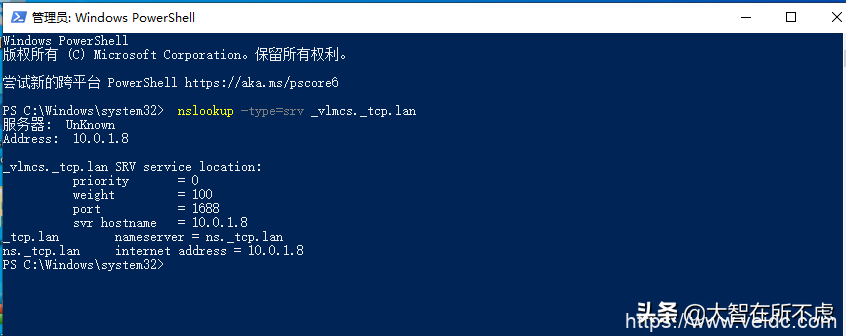 再打开powershell输入nslookup -type=srv _vlmcs._tcp.lan