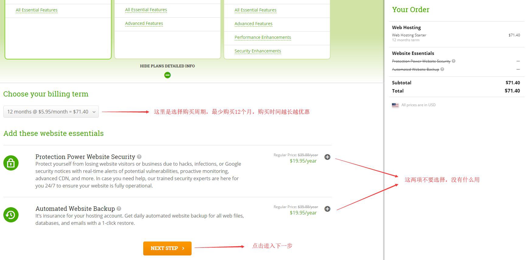 跳转后,往下滑动,选择购买周期,最少购买一年,购买时间约长就越优惠,然后去掉下面的附加选项,没有什么用,都是主机公司为了多赚钱的,如下图所示: