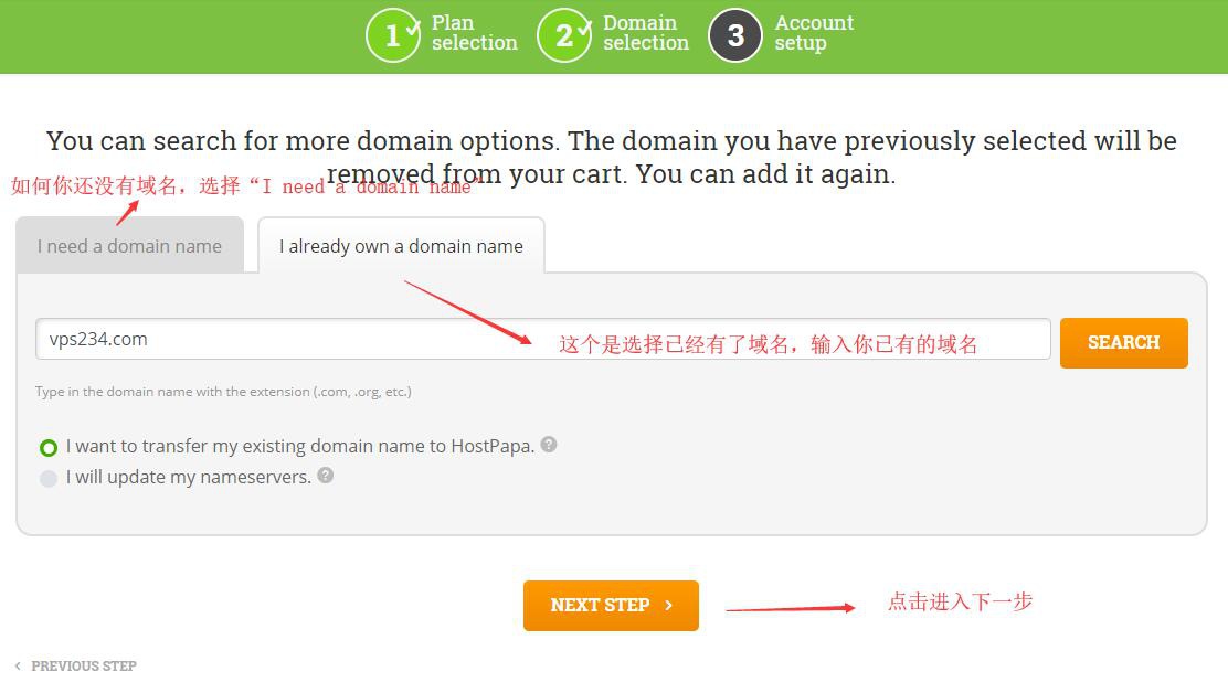 跳转后就是设置域名了,使用虚拟主机部署网站肯定是需要一个域名的,如果你没有域名,你选择注册一个域名,如果有了域名你就输入你的域名,如下图所示: