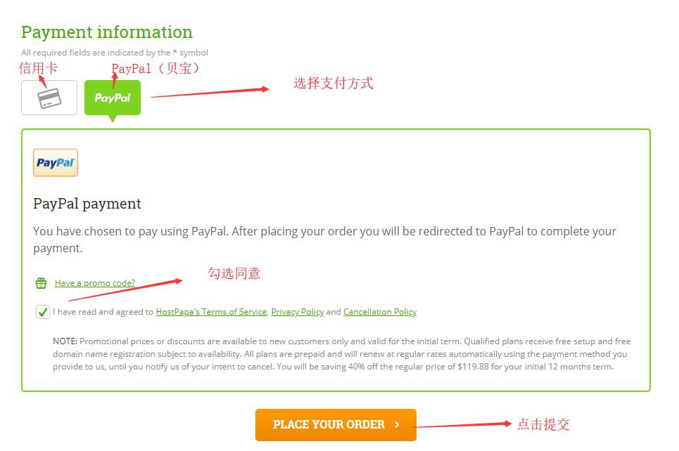 然后选择支付方式,可以支持信用卡或者PayPal付款,然后勾选同意协议,如下图所示: