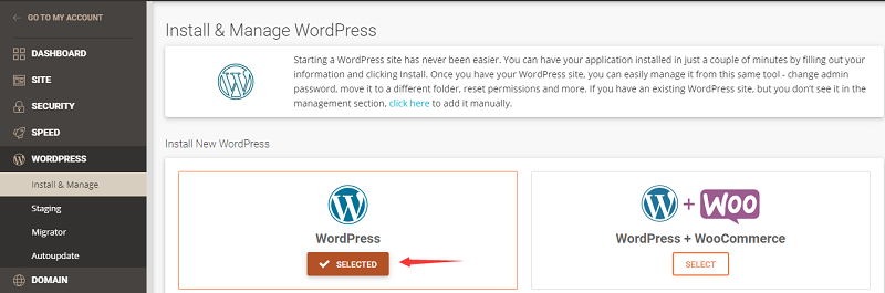 第二步,选择左侧菜单栏中的WordPress,然后选择子菜单中的Install & Manage,WordPress网站安装有两种版本,一是直接安装WordPress网站,二是安装WordPress+WooCommerce,大家根据自己的需要进行选择。选择以后,点击SELECTED进入下一步。
