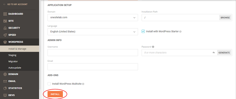 第三步,接下来是一键安装WordPress网站的相关信息设置(APPLICATION SETUP),选择我们要安装WordPress的网站域名(domain),后面的Installation Path指的是安装路径(一般留空即可),外贸网站语言(Language)选择英文。其中Install with WordPress Starter指的是选择安装含有WordPress主题和插件的安装方式,勾选该选项安装WordPress以后后台会送你一些WordPress主题模板和一些WordPress插件。