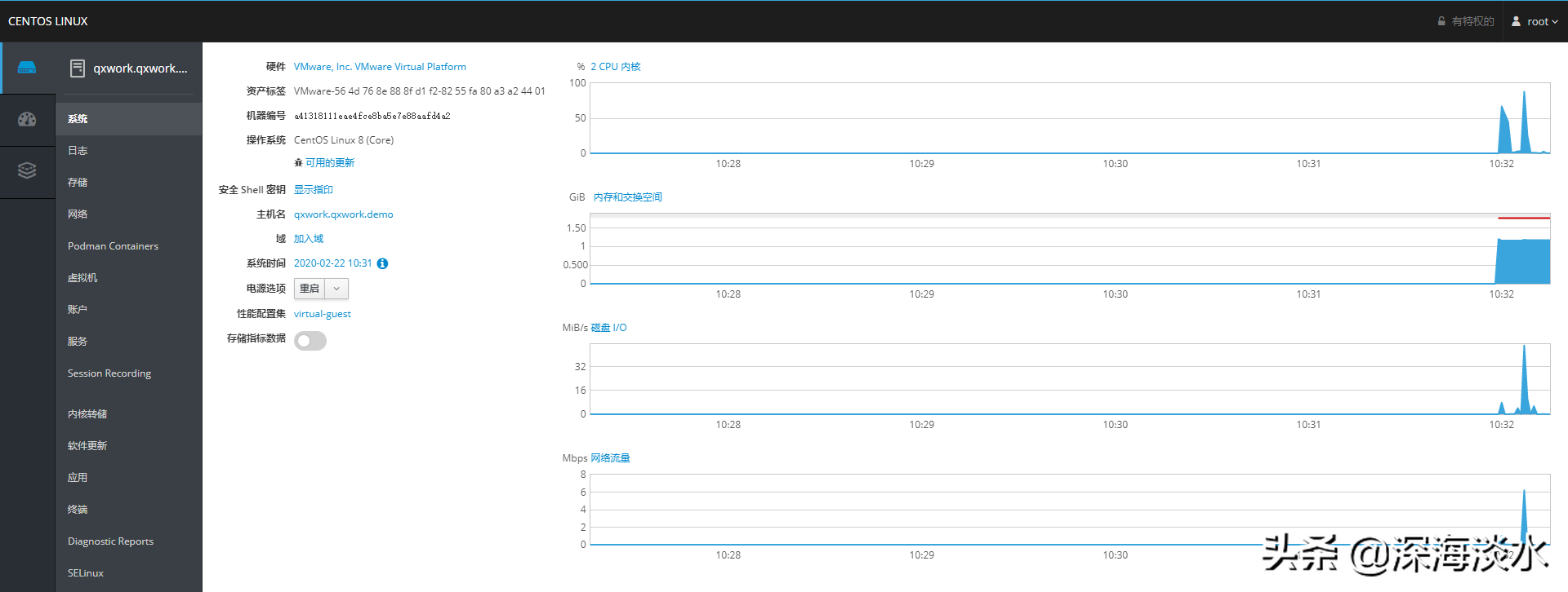 Cockpit是一个非常方便的WEB管理控制台,安装之后管理Linux服务器比较方便,特别是监控系统运行。在Web浏览器中查看服务器,然后用鼠标执行系统任务。启动容器,管理存储,配置网络和检查日志很容易。