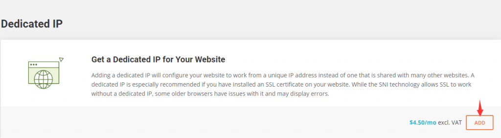 然后在新打开的Dedicated IP页面我们可以看到独立IP的相关介绍以及购买价格:4.5美元/月,点击“ADD”开始购买。