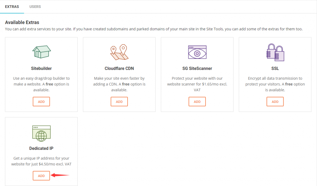 首先登陆SiteGround主机管理后台,在Websites下的EXTRAS中找到Dedicated IP,点击“ADD”进入下一步,