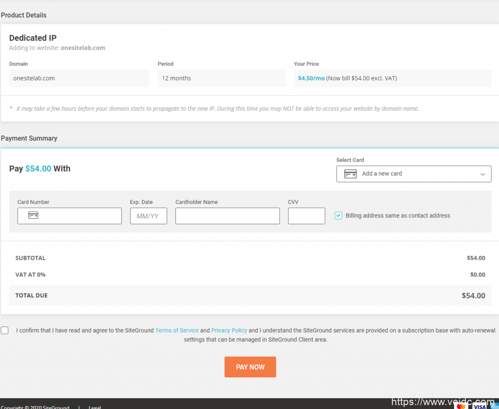 接着在页面方会有购买独立IP的购买信息和付款信息,在Payment Summary中输入要使用的信用卡信息,最后确认服务条款并点击“PAY NOW”完成付款即可。