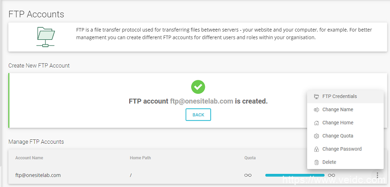 点击已创建的FTP账号Actions,可以看到账号的操作选项,包括FTP Credentials(账号信息),Change Name(更改名称)Change Home(更改路径),Change Quota(更改限额),Change Password(更改密码)等选项。