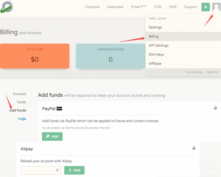 点击右上角的头像,选择Billing,然后再选择Add funds,这里就可以充值了,可以看到支持paypal和alipay(支付宝),在输入框那里填写要充值的金额,然后点击后面绿色的Add就会跳转到充值页面了。
