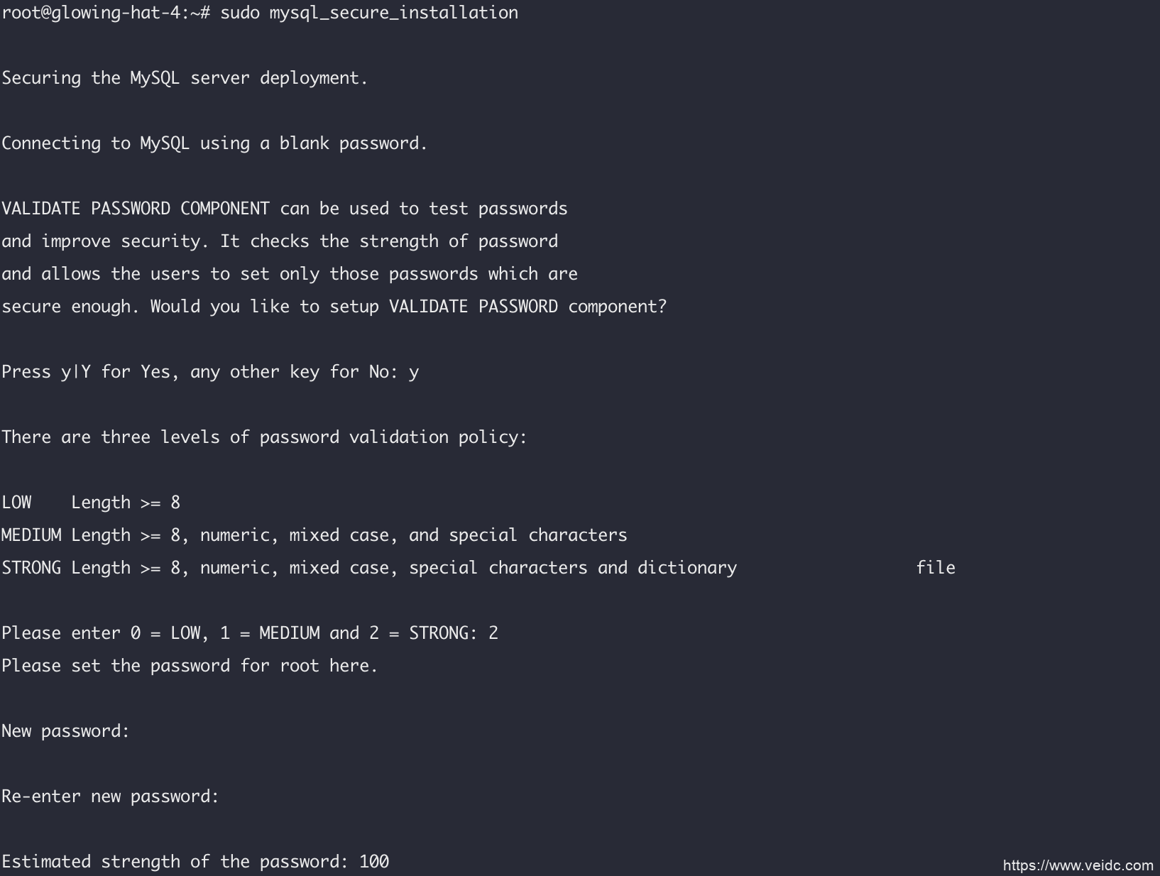 输入y回车,选择2,最强密码,输入新密码,这个密码是mysql 的root密码。