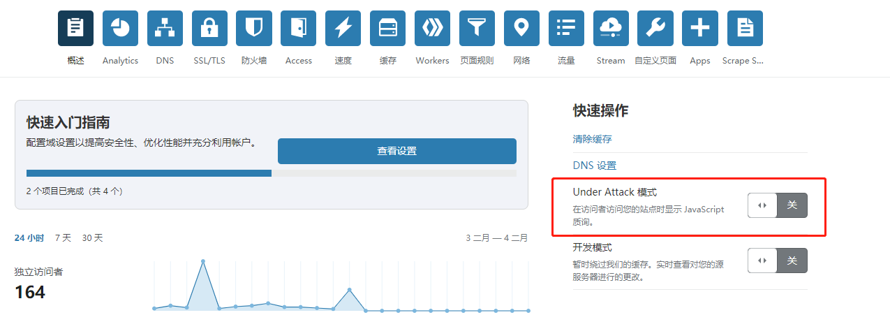 另外,开启under attack模式。可有效阻止中小型攻击。