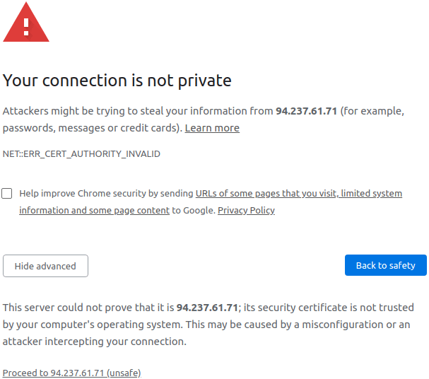首次访问仪表板时,您将在Web浏览器上收到潜在的安全风险提示。这是因为Webmin首次安装时会使用自签名SSL证书。这些SSL证书可以在以后替换。