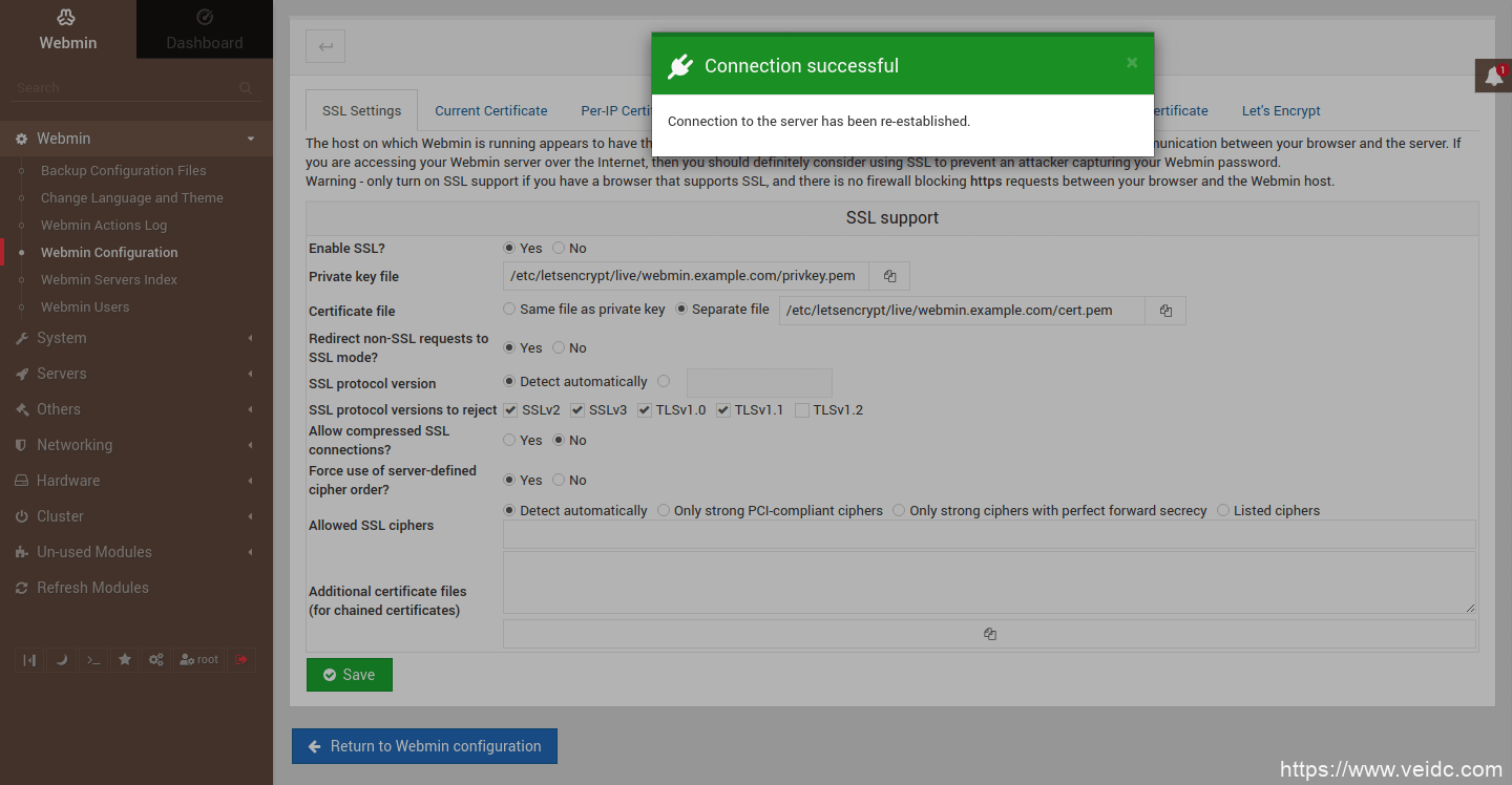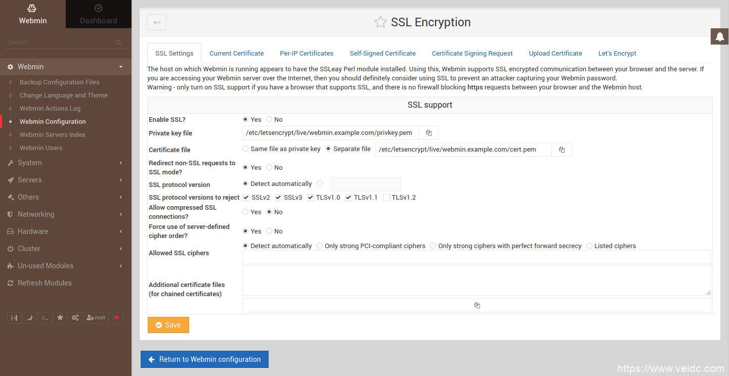 现在有了有效的证书,我们需要告诉Webmin使用它们,而不是默认的自签名证书。
