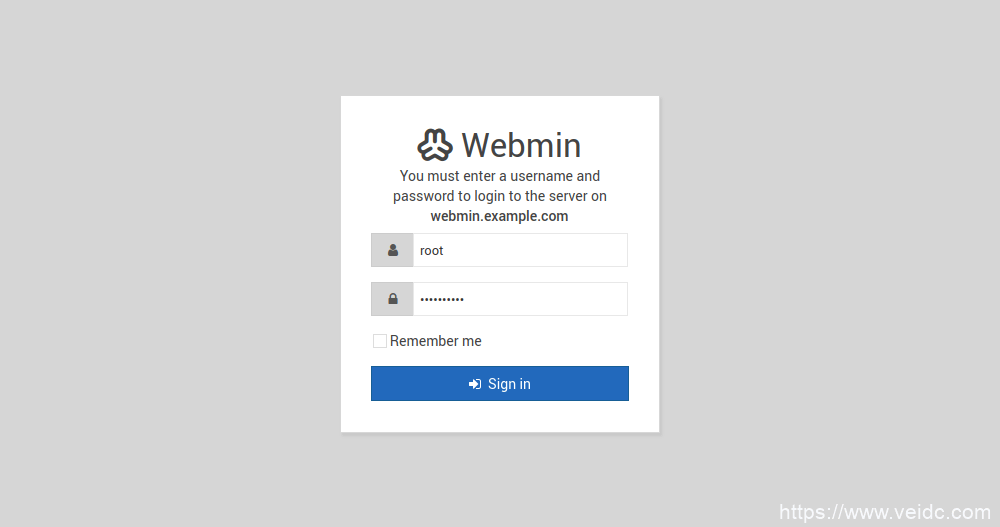 忽略安全警告后,您将看到Webmin登录页面,如下所示。