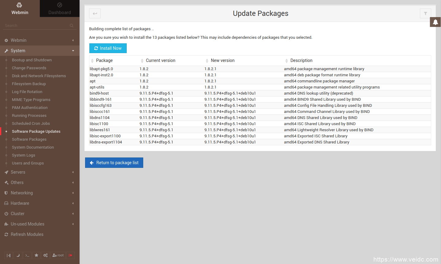 仔细检查选择更新的软件包列表,然后单击“立即安装”按钮进行确认。