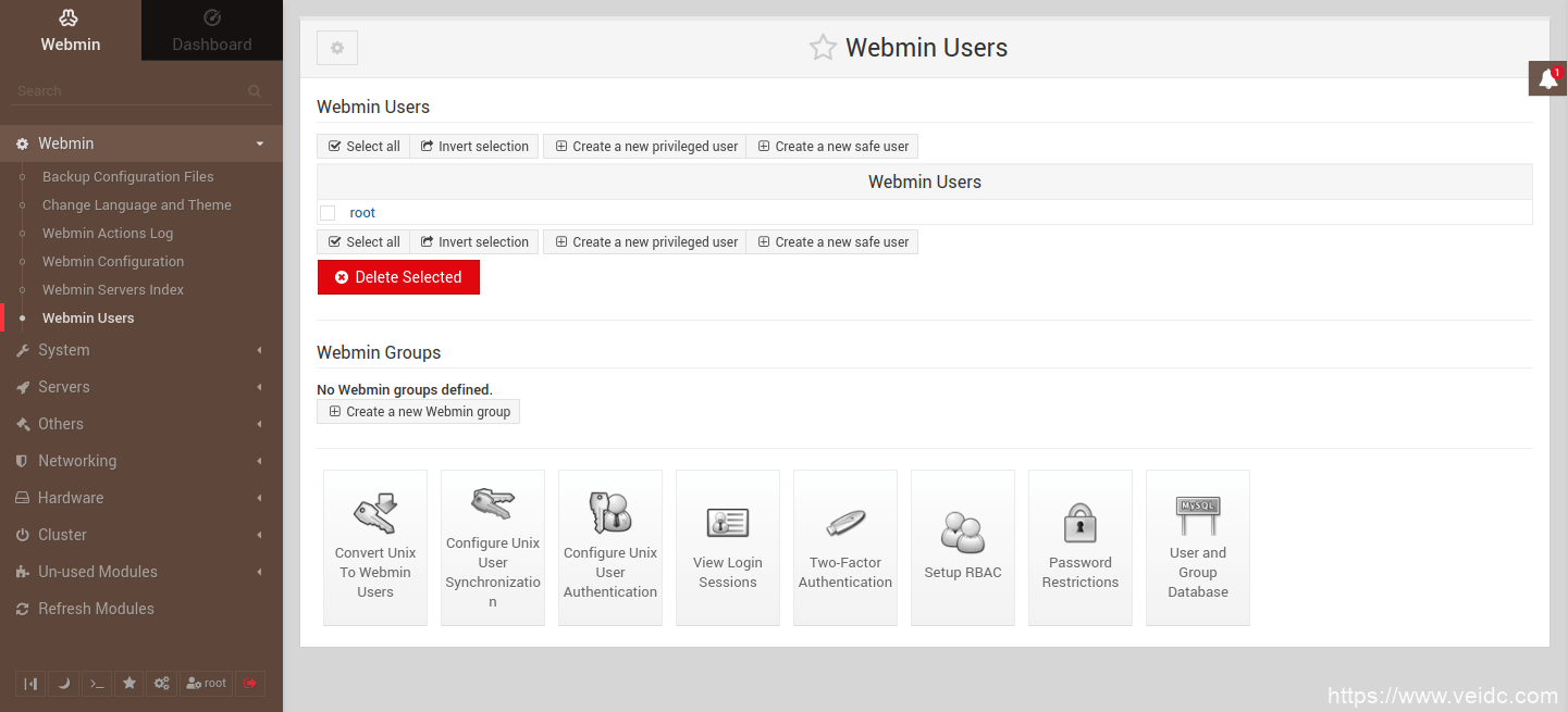 由于默认的访问控制,另一个推荐的步骤是禁用Webmin上的root登录或完全删除它,并使用具有sudo特权的现有帐户,或者单独为Webmin创建一个新帐户。