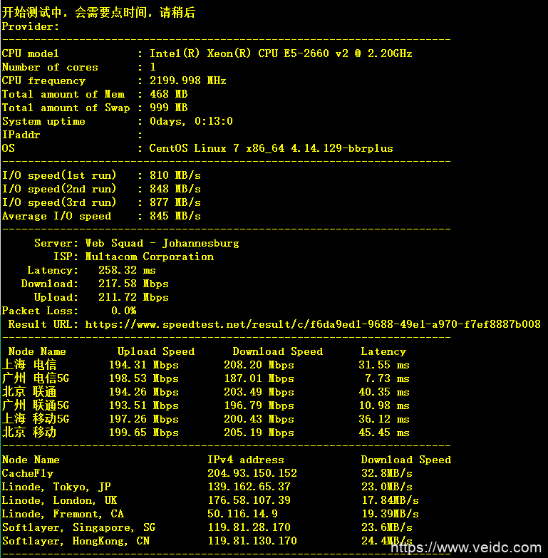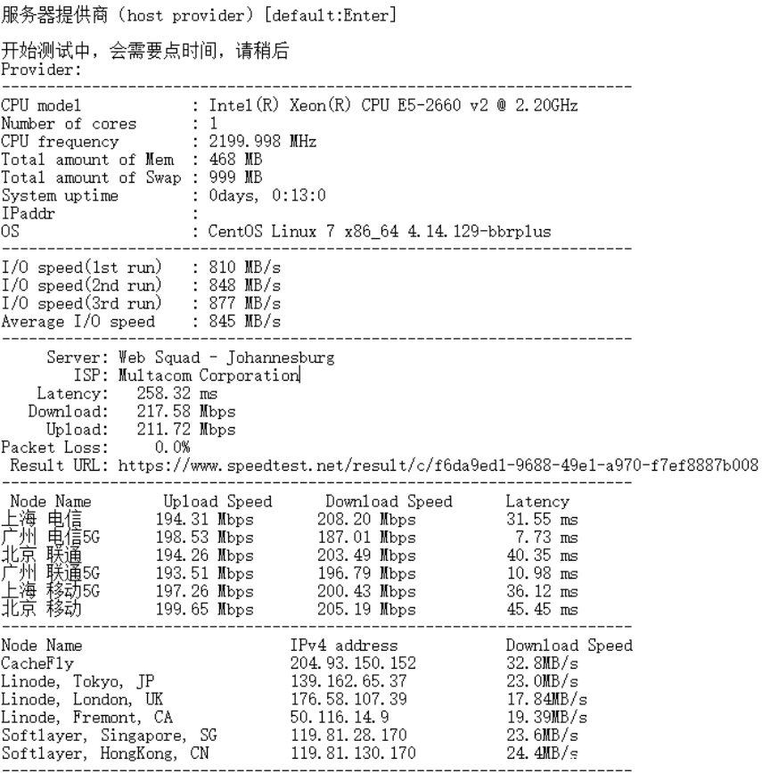 IO测试、宽带测试,硬盘平均速度超过800MB/s,带宽上下行速度达到200M/s: