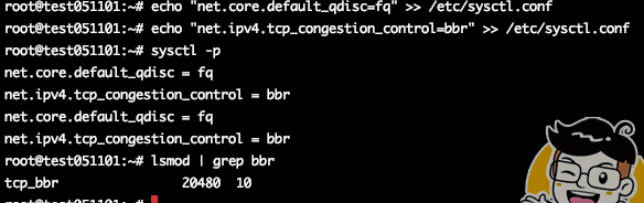 echo "net.core.default_qdisc=fq" >> /etc/sysctl.conf echo "net.ipv4.tcp_congestion_control=bbr" >> /etc/sysctl.conf sysctl -p lsmod | grep bbr