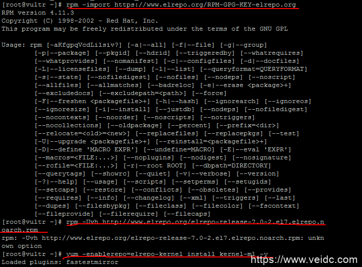 rpm –import https://www.elrepo.org/RPM-GPG-KEY-elrepo.org rpm -Uvh http://www.elrepo.org/elrepo-release-7.0-2.el7.elrepo.noarch.rpm yum –enablerepo=elrepo-kernel install kernel-ml -y
