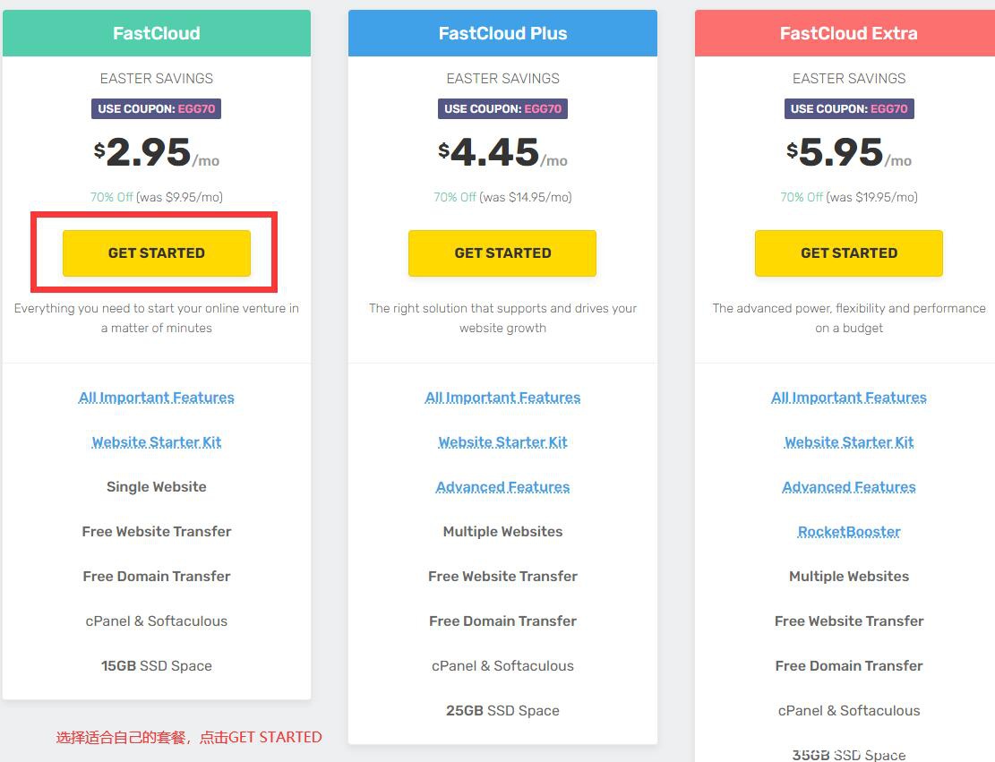 跳转到 FastComet 虚拟主机的套餐选择页面,这里有三种套餐(上一篇文章中我们之前介绍过这三种套餐的配置),建议个人网站流量不是太大就选择最便宜的套餐,如下图所示:
