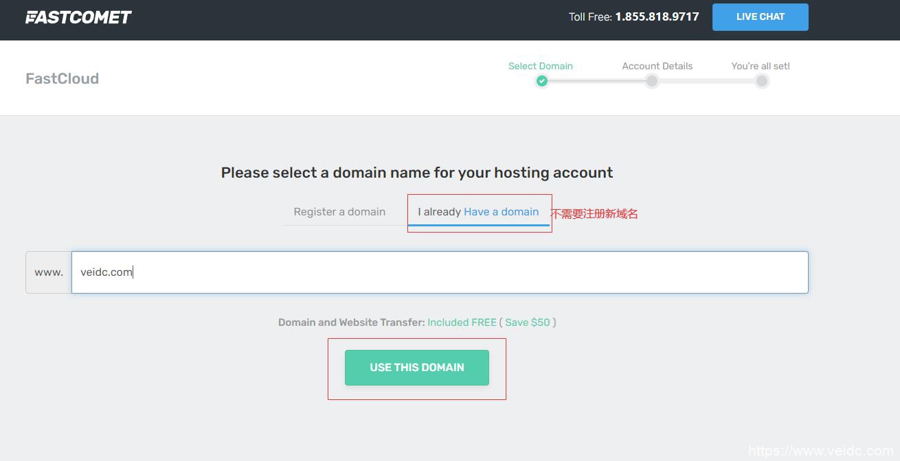 然后跳转到选择域名页面,用自己已经有的域名,然后点击“Use This Domain”按钮进入下一步