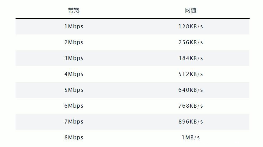 这里有一个不同带宽所对应的网速表,可以参考一下:
