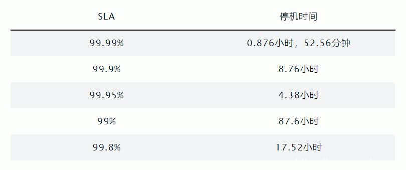具体的计算方法是 SLA 是 99%,代表一年有1%的时间可能停机,365 * 24 * 0.01 = 87.6小时。
