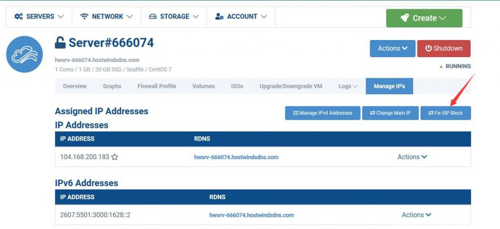 必须用国内 ip 访问 hostwinds 的官网,并且你的 hostwinds 账号信息中的国家选项选择的是“China”才会出现免费更换ip的按钮,通过点击“Fix ISP Block”即可更换,更换完成后记得点击“reboot”重启服务器。