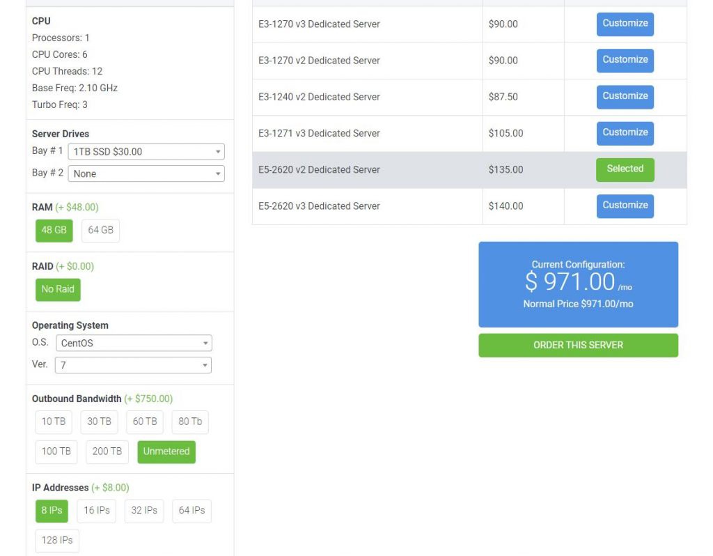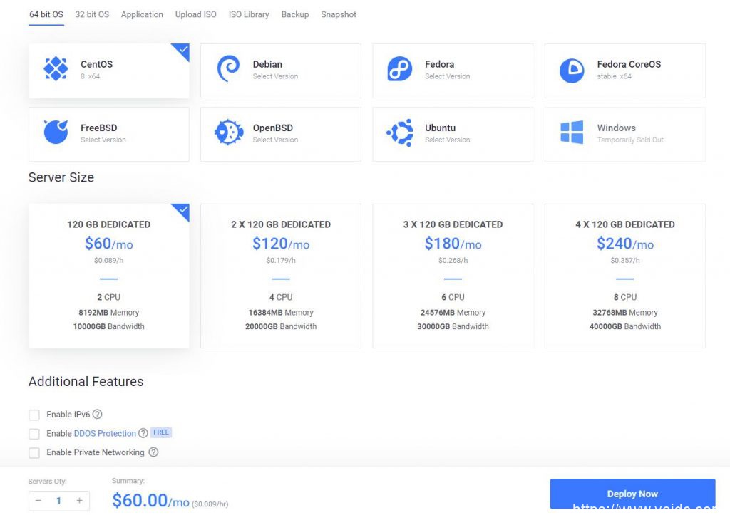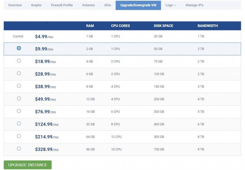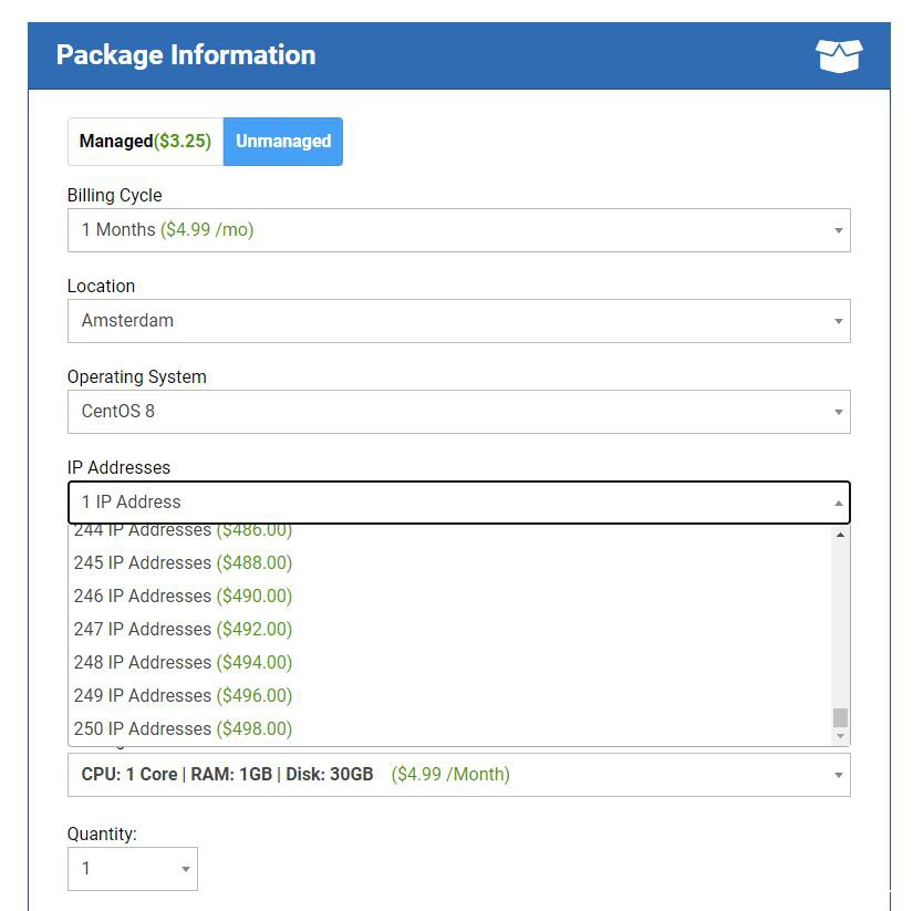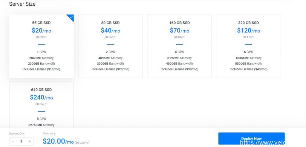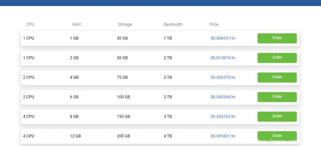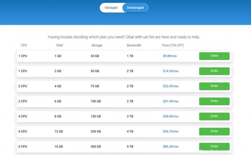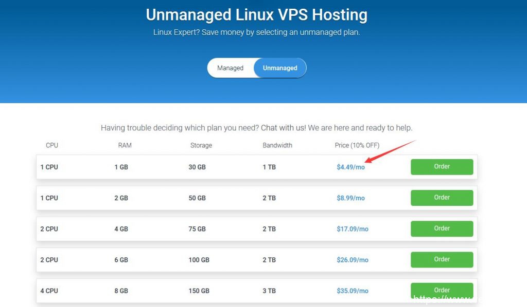4、性价比高;Unmanaged Linux VPS 首次付款9折优惠,4.49刀/月,配置是SSD固态硬盘空间30G,内存1G,流量1T/月,共享带宽1Gbps,建议购买 Unmanaged 型,没有必要多花钱购买managed型, Unmanaged型相当于一台裸机,提供了一个原生的操作系统,所有软件可以根据自己的需求来安装,这样有更大的灵活性。