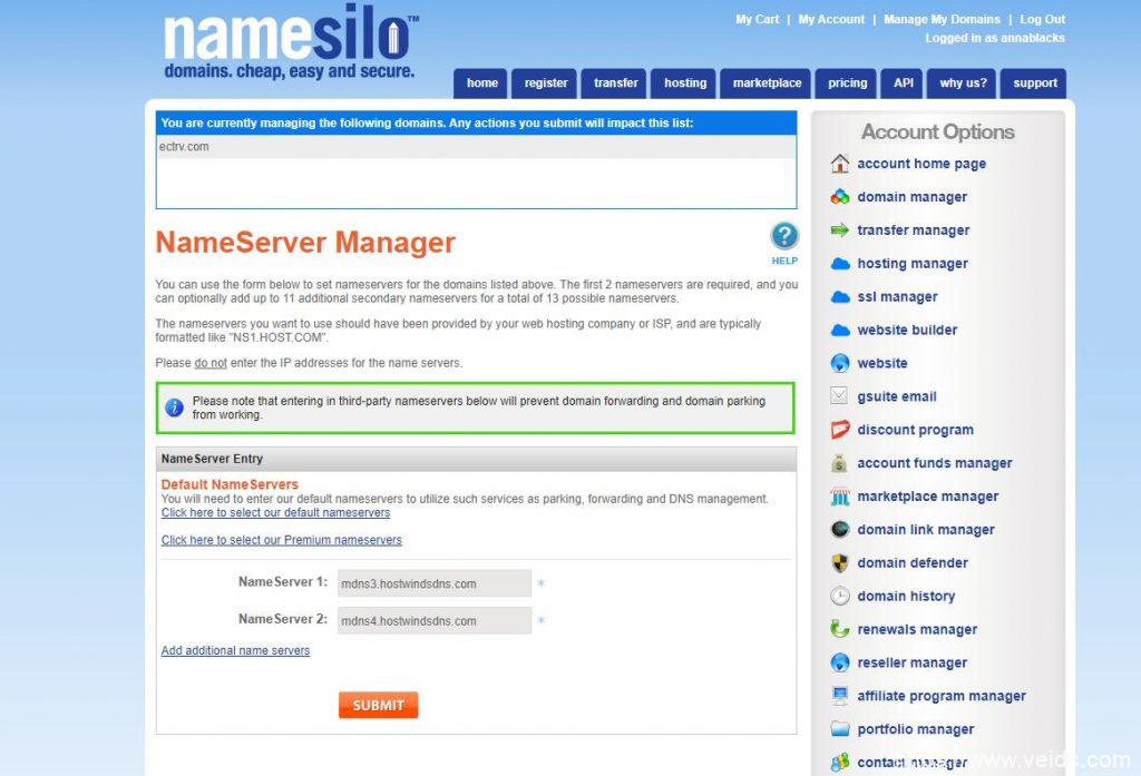 10、提供域名托管服务;如果打算用hostwinds搭建网站, 我建议把解析权交给 hostwinds ,也就是说,把 namesilo 的NS 地址改成 hostwinds 的 NS 地址,这样交接域名解析任务之后,域名解析都在 hostwind 进行,可以省去很多麻烦,设置方法如下图: