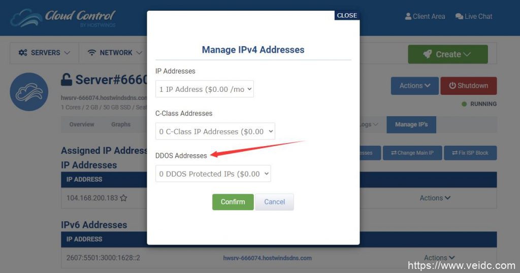 3、对中国用户提供免费换 IP 服务;这个功能是 Hostwinds 基于中国的国情 ,专门为因上网而被封 ip 的中国用户提供的免费服务,且不限次数,而国外用户换 ip 需要花费 3 美元/次,操作方法如下图: