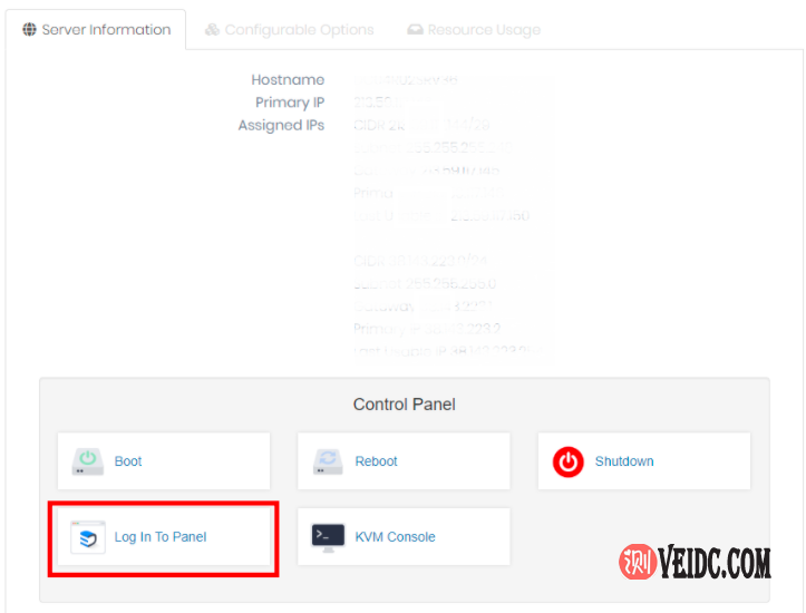 2、进入产品方案列表页面,选中想要重置IPMI的独立服务器方案,然后在服务器配置详情页面选择“Login In To Panel”选项,具体参看下图: