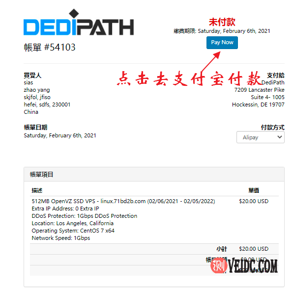 6、最后进入账单详情页面,核对好金额之后,点击Pay Now按钮去付款,支付完成之后该VPS方案也就购买完成了。