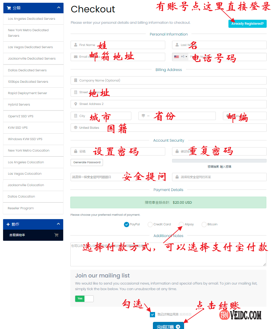 5、进入结账页面,需要在账号注册页面填写注册信息(如果有账号直接登录即可),然后选择付款方式,填写完成之后点击页面底部的“完成订购”按钮进行付款: