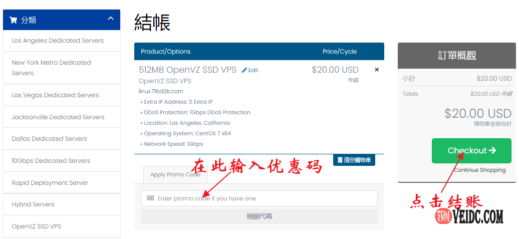 4、进入结账页面后,首先核对好方案参数配置,然后在Promo Code输入框中输入合适的DediPath优惠码,输入之后点击“Checkout”按钮进行结账: